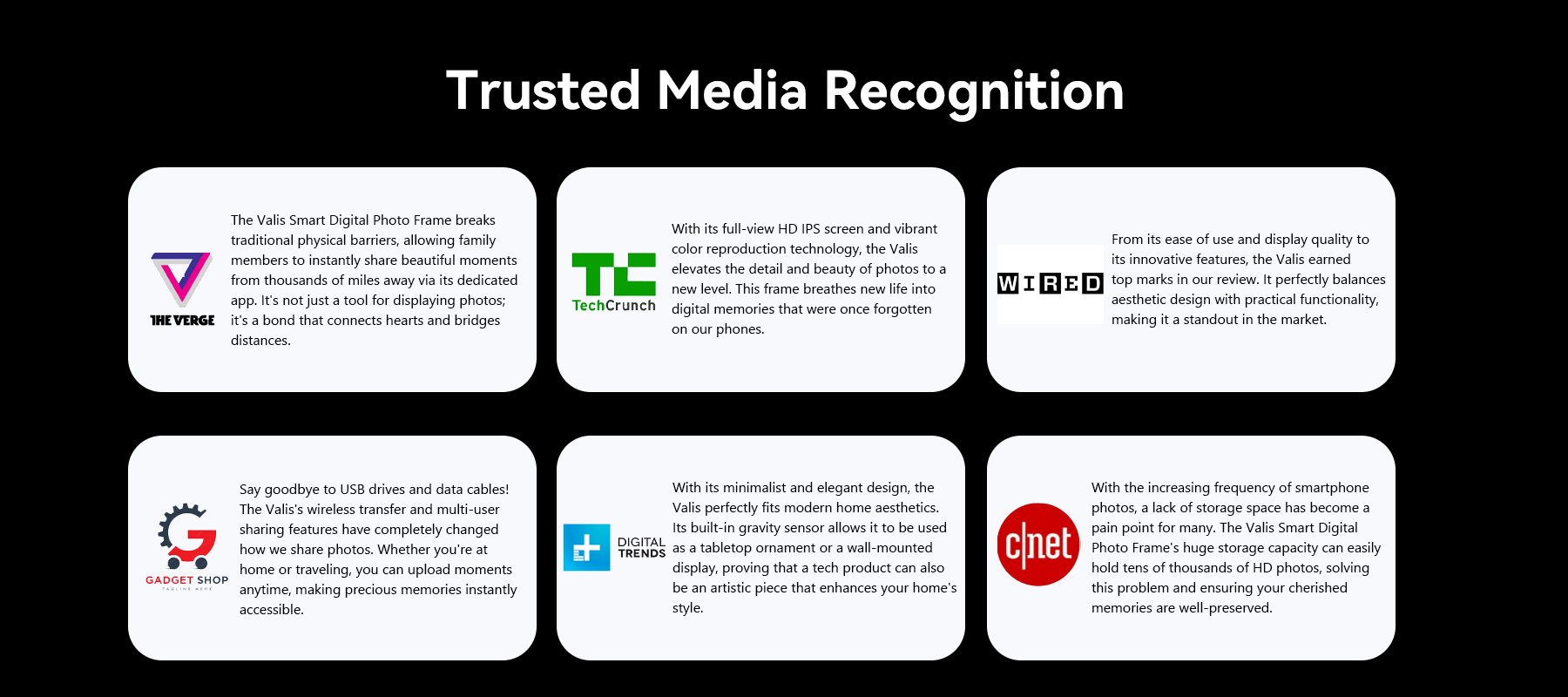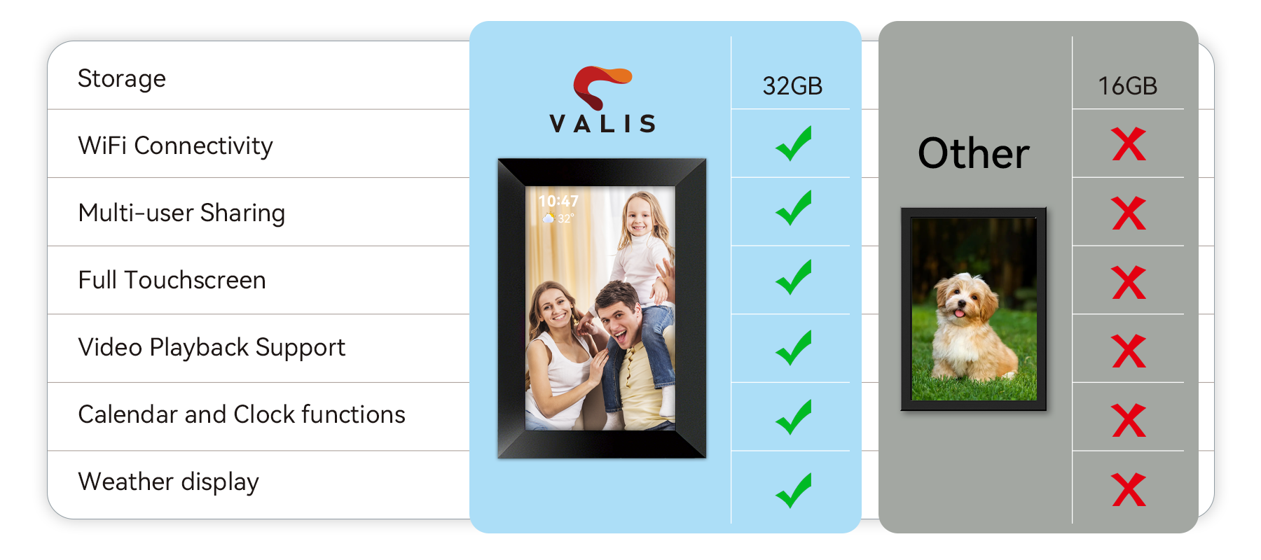 The result was the Valis Smart Photo Frame—with powerful Wi-Fi and a simple, user-friendly design, it makes sharing effortless while displaying every moment in vivid HD. Valis’s mission is clear: turning digital clutter into the joy of sharing, so you can focus on the memories, not the technology.