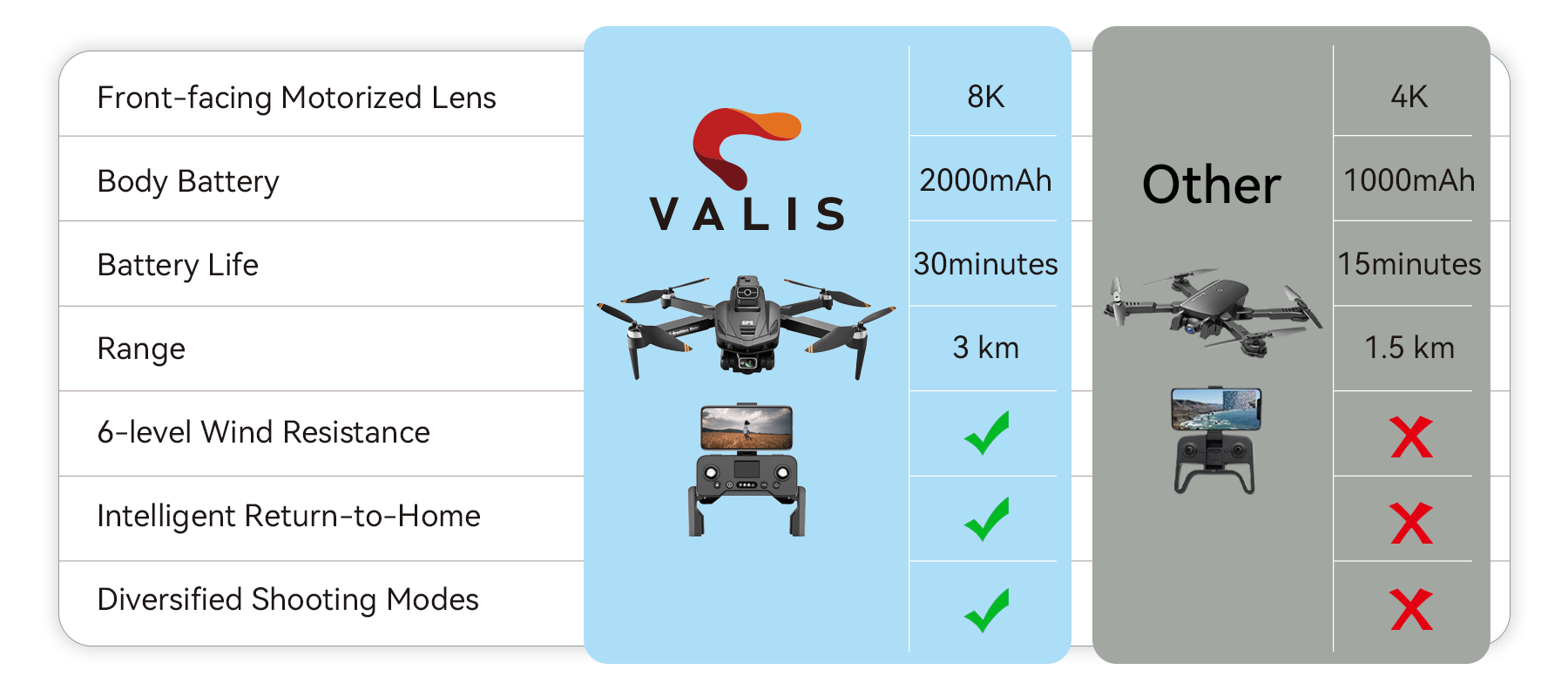 The Valis drone’s robust GPS system features a fully automatic Safe Return mechanism. Beyond the user-initiated [One-Key RTH], the system auto-activates in three critical scenarios: 1. [Low Battery RTH], 2. [Failsafe RTH] (Loss of Signal), and 3. [Beyond-Range Return-to-Home] (plans a clear path home). These four modes form an invisible safety net, ensuring you explore the sky with complete confidence.