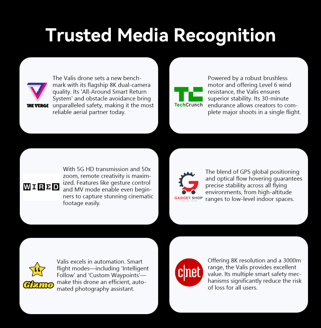The Valis drone features Level 6 wind resistance (approx. 10.8-13.8 m/s), thanks to its powerful brushless motors and aerodynamic design. Even in strong winds typical of high altitudes or coastal areas, the drone maintains precise hovering and a stable flight path. This ensures you never miss a perfect shot due to weather, keeping every frame clear and smooth.